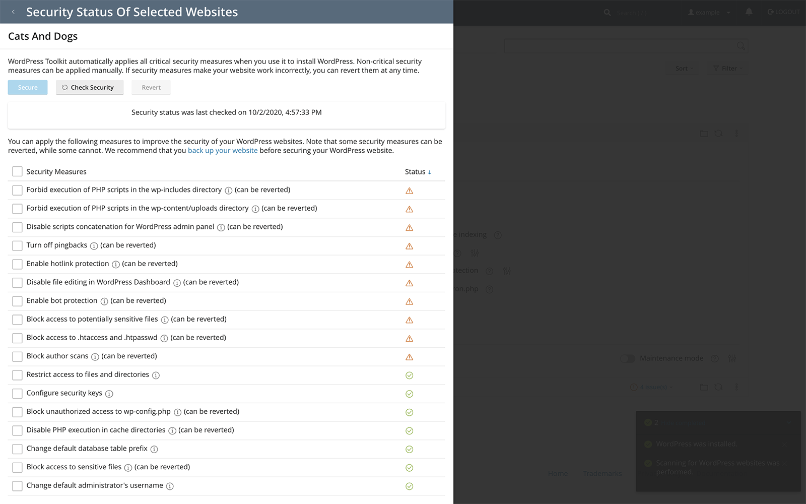 WP Toolkit is a management interface for WordPress from cPanel and Plesk that allows you to install, configure, and manage WordPress websites.